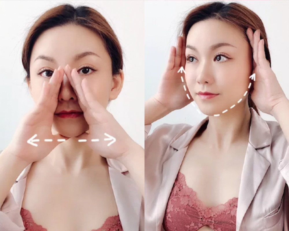 首先將手掌張開,並以食指和中指夾住唇部上下,接著沿著臉部輪廓向上提拉到耳後~這步每一側做20次。這一步可以幫助加強臉部正面輪廓線條,臉部中心會看起來會更膨潤好看!