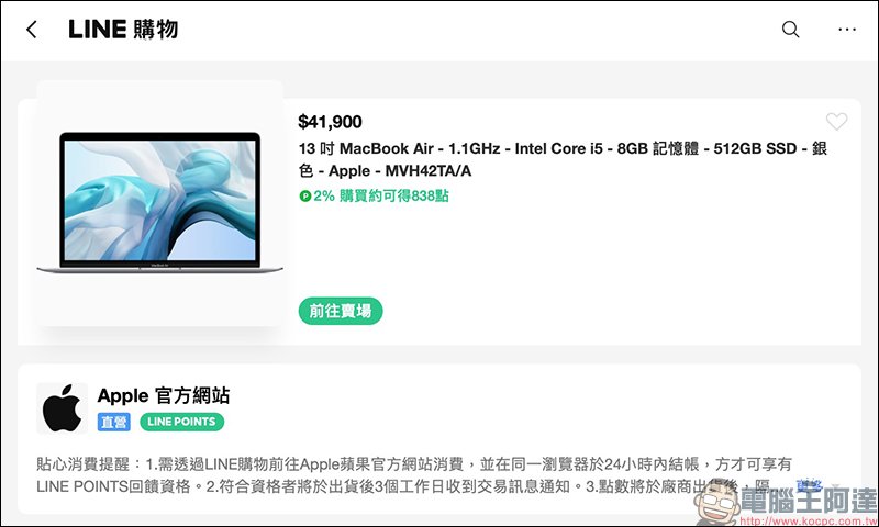 筆者推薦的這款 MacBook Air 官方建議售價為 41,900 元,若以 LINE POINTS 2% 點數回饋來計算可賺取 838 點 LINE POINTS ,相當於 98 折優惠。