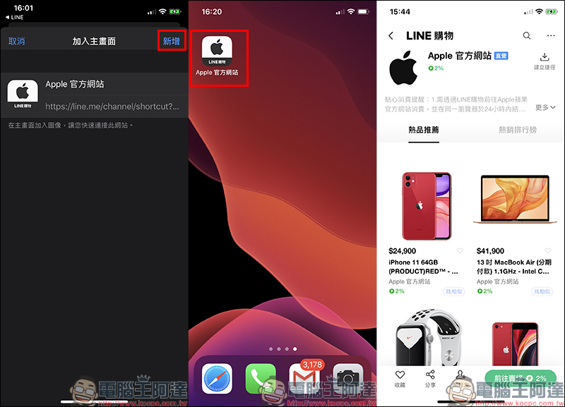 如果身為喜愛 Apple 產品的果粉,想在未來想買 iPhone 等 Apple 產品時能節省上述搜尋 LINE 購物的流程,可以先在第一次前往 LINE 購物的 Apple 官方網站頁面並點選畫面上的「建立捷徑」按鈕,接著依循頁面指示將此頁面「加入主畫面」: