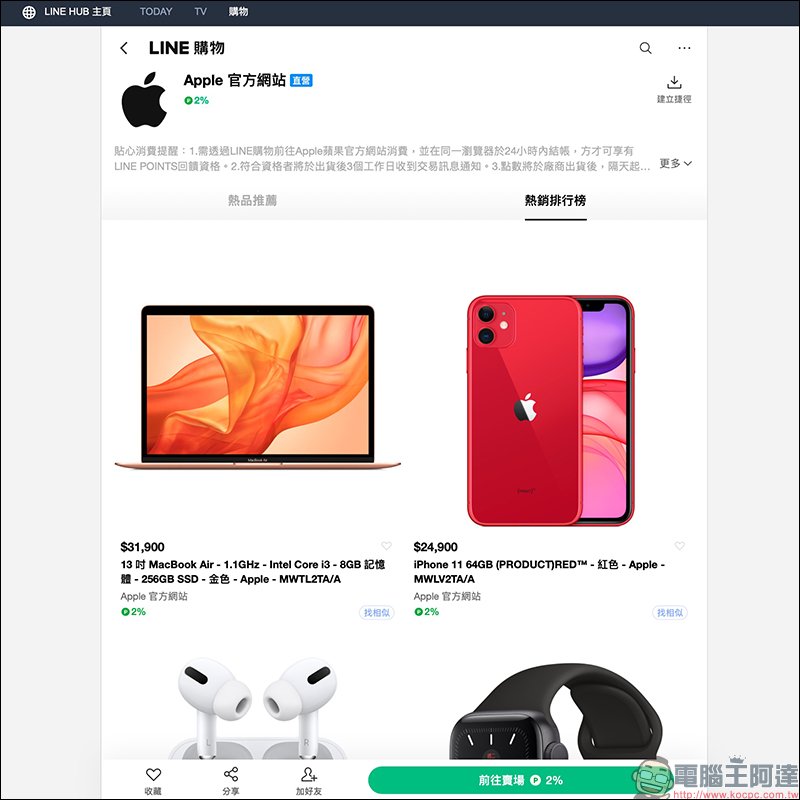 另外,若平時習慣使用電腦平台購物的消費者,可直接前往 LINE 購物 Apple 官方商店(點我前往)頁面,差別在於需要經過 LINE 帳號登入流程才能選購 LINE 購物的商品:
