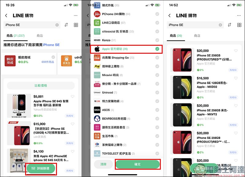 首先,在 LINE 購物頁面的文字輸入欄位輸入想尋找的商品或品牌,可查詢到相當多電商平台都有販售 iPhone SE ,若想找到來自 Apple 官方網站販售的產品,只需點選畫面下方的「詳細篩選」功能,接著找到「Apple 官方網站」並按下確認即可,經篩選後的結果就都是來自 Apple 官方網站的 iPhone SE :