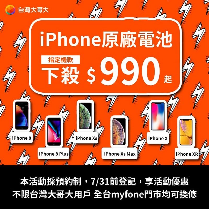 此次提供的iPhone型號包含兩種換修優惠價:iPhone 8/8 Plus,優惠換修價$990 (原價$1,890);iPhone X/Xs/Xs Max/XR,優惠換修價$1,680 (原價$2,490),欲更換者需先在7/31至活動網站登記,並填寫換修電池的手機IMEI等資料後,台灣大哥大將以簡訊方式通知送修時間,消費者再於簡訊通知的期間內將設備送至全台myfone門市,始符合活動優惠。