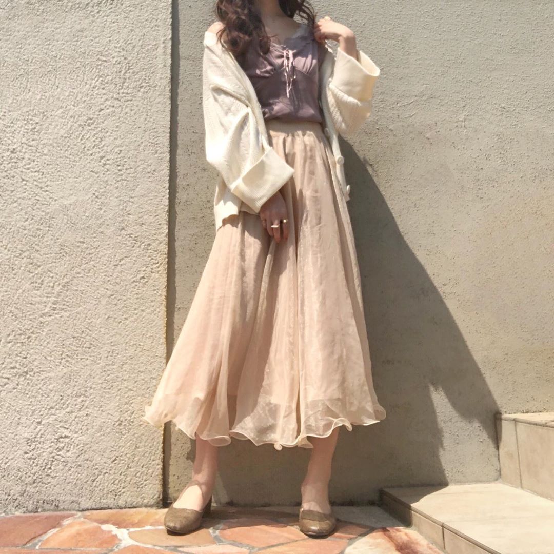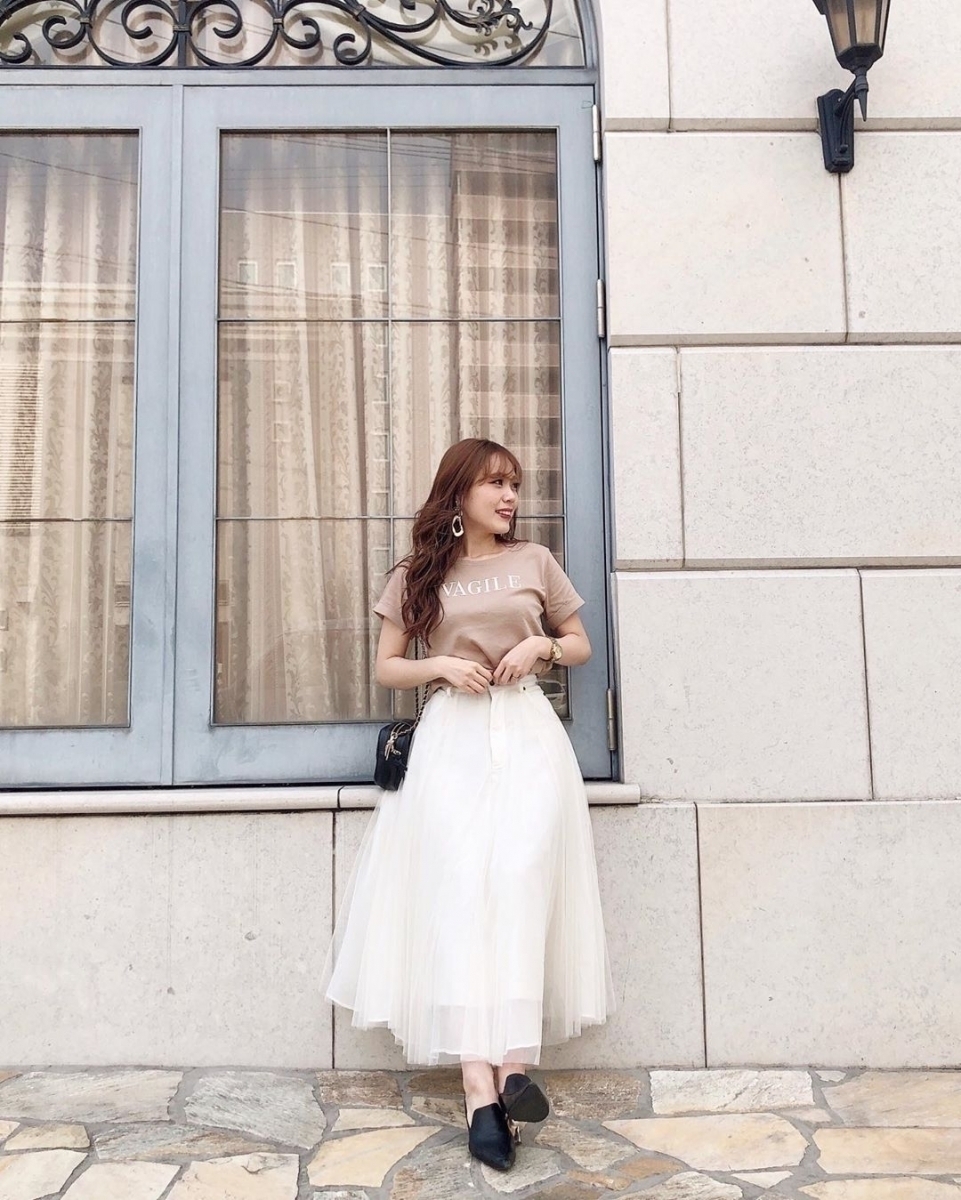 帶有份量感的紗裙是個很顯眼的單品,若是沒有搭配好的話,可能會讓整體造型感覺非常混亂。穿著紗裙時,建議將全身穿著統整為淺色色調。若是用與膚色相襯的米色單品做搭配,就能打造出具有女人味又甜美的可愛造型。