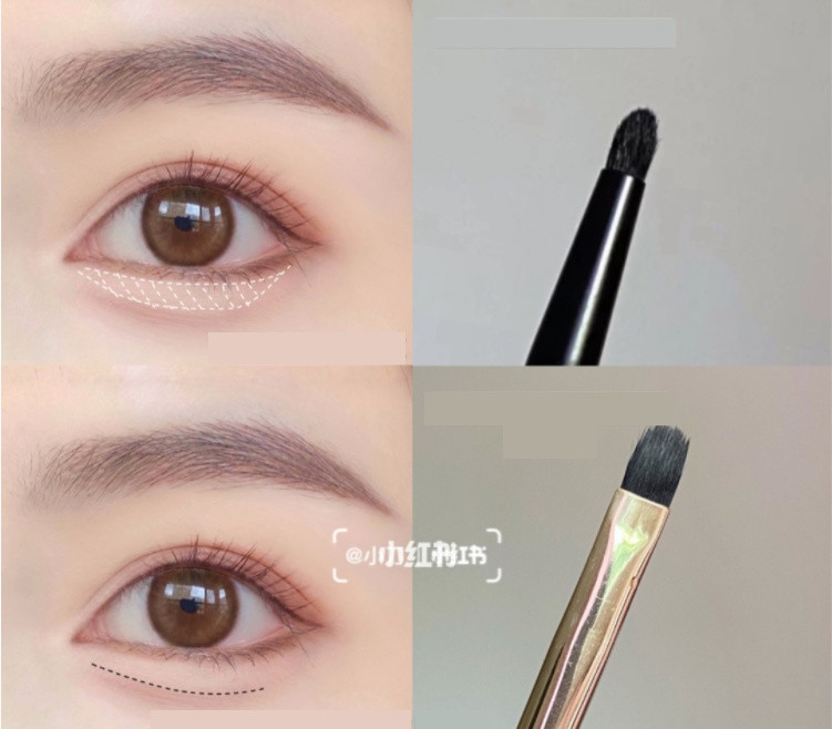 接著,我們換小號眼影刷,加深雙眼皮皺褶和眼尾(如圖所示,暈染寬度不要超過眼球,而高度範圍約在睫毛根部上1-3mm。)下眼影則畫後端1/3,不要畫超過一半的範圍。其實到這邊,日常眼妝就已經完成囉~是不是很簡單的,但要完美複製橋本環奈的眼妝,接下來的臥蠶和隱藏眼線也是一大重點!