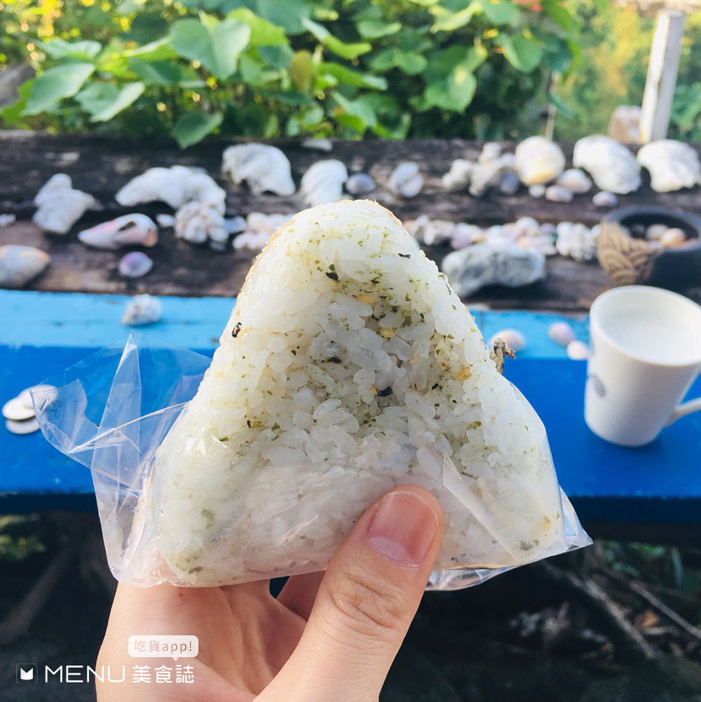 一人限購一顆!這顆飛魚飯糰有著微微甜的魚鬆味和飛魚的燻香味,裡面的飛魚肉也不少,搭配濃濃的豆漿,滿足!