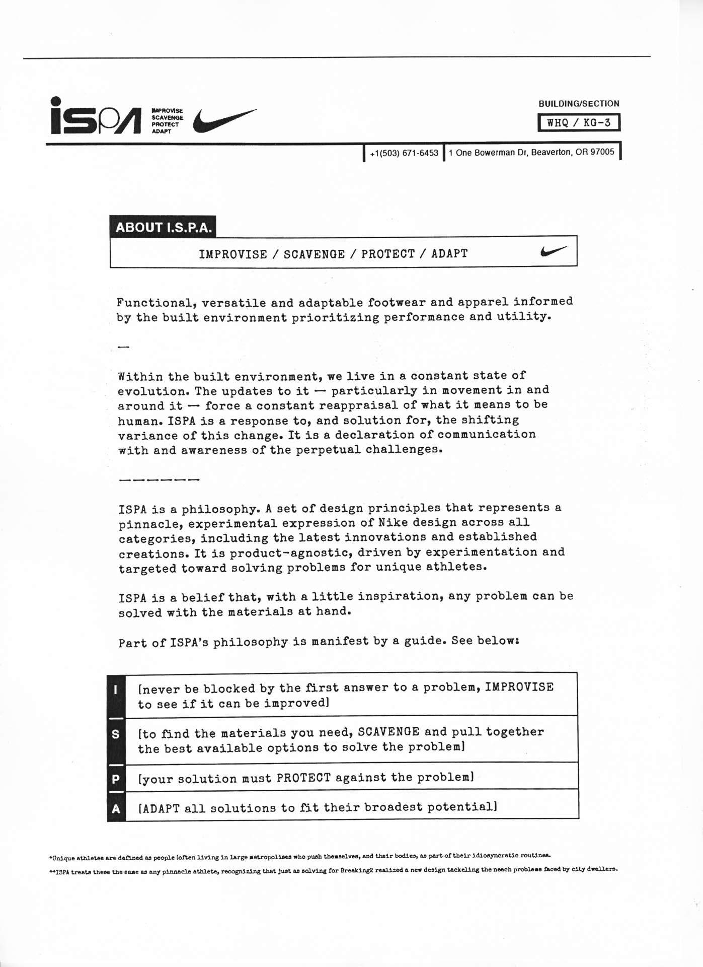 大膽開孔的 NIKE FLOW 的設計靈感來自於總是親自動手製作運動配備的極限運動員,在惡劣環境的挑戰下,極限運動員對於各種器材的重量總是錙銖必較,能夠減去的重量永遠不嫌少,ISPA Flow 全天候鞋款的重量被減到極致,穿孔外底設計保證內外空氣流通,有如腳踏微風。