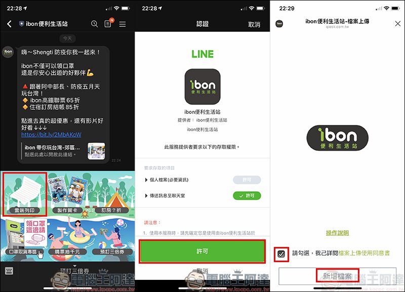 將 ibon 便利生活站加為好友後,在聊天室頁面下方的功能選單點選「雲端列印」,第一次使用需要先允許存取權限,接著勾選以詳閱檔案上傳使用同意書,最後按下「新增檔案」: