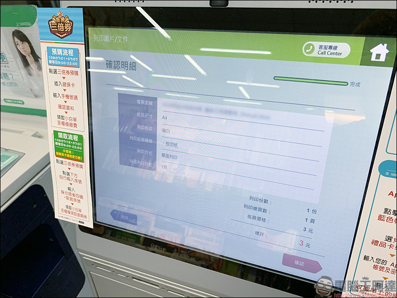 最後的確認明細會顯示列印的總金額,確認沒問題就能按下右下角的「確認」開始列印。列印完成後, ibon 機台會輸出繳費的小白單,將小白單交給店員結帳即可。(*小提醒:可別忘記將列印好的文件帶走呀!)