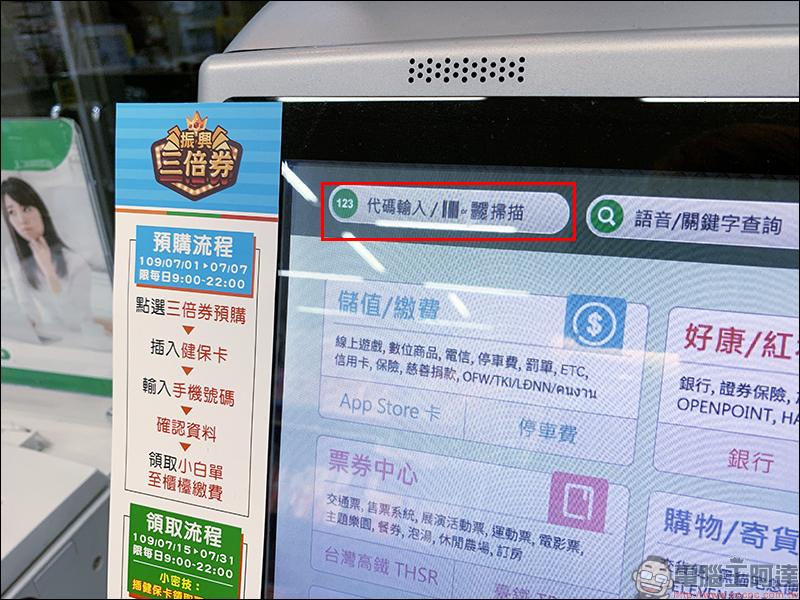 為了方便些不知該如何操作 ibon 雲端列印功能的讀者快速了解操作機台步驟,以下由筆者親自帶各位一步步操作機台。首先,在 ibon 首頁的畫面左上角,點選「代碼輸入/掃描」: