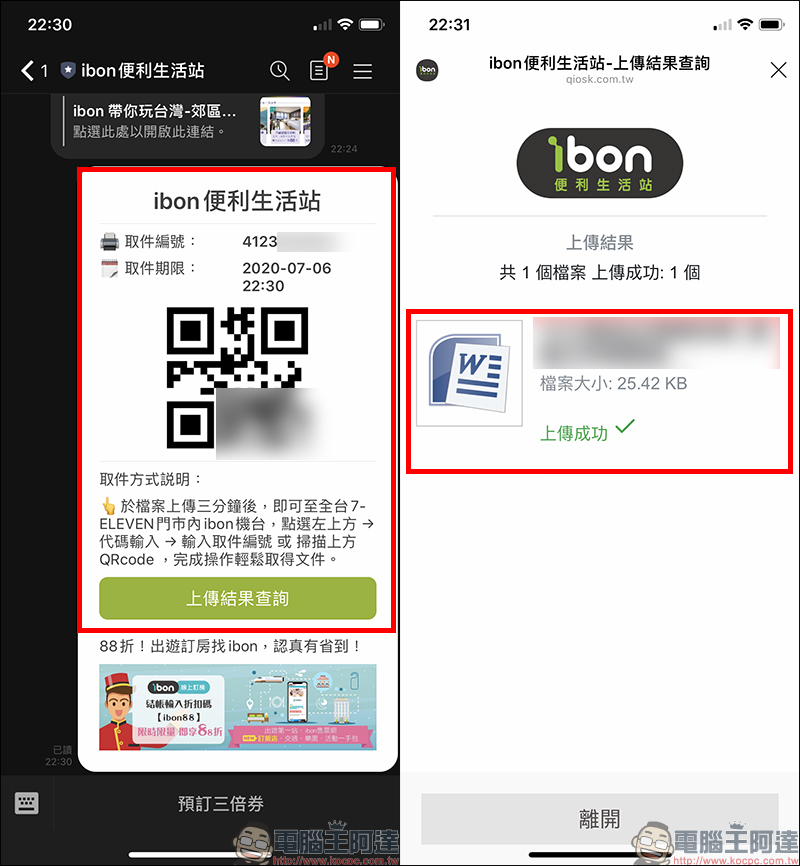 上傳完成後,會自動返回 LINE ibon 便利生活站聊天室頁面,並自動彈出取件編號和 QR Code 條碼,在檔案上傳三分鐘後,用戶即可至全台 7-11 門市內的 ibon 機台操作,下載檔案並進行列印。倘若不確定上傳結果如何,也能隨時點選「上傳結果查詢」按鈕查看已上傳之檔案: