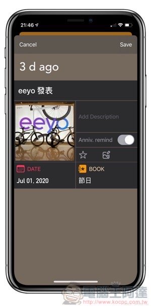應用剛開啟的時候會需要先新增類似類別的「記錄本」— 除了命名也可以選擇顏色與圖示,接著就可以新增並設定特定日子的名稱與日期:
