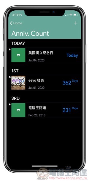 新增各種紀念日或節日後,就可以透過主介面切換檢視全部的紀錄(會顯示截至目前為止的天數 — 用來計算到職時間蠻不錯的,或者是車買了多久之類的)與每年的倒數日剩下多少天,還可以用時間軸檢視幾個紀念日即將到來的排序,也可以把幾個更重要的日子標注為星號: