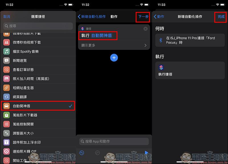 在選擇捷徑中,點選上述已經設定好的自動開啟神盾 App 的捷徑腳本,接著依序選擇下一步和完成: