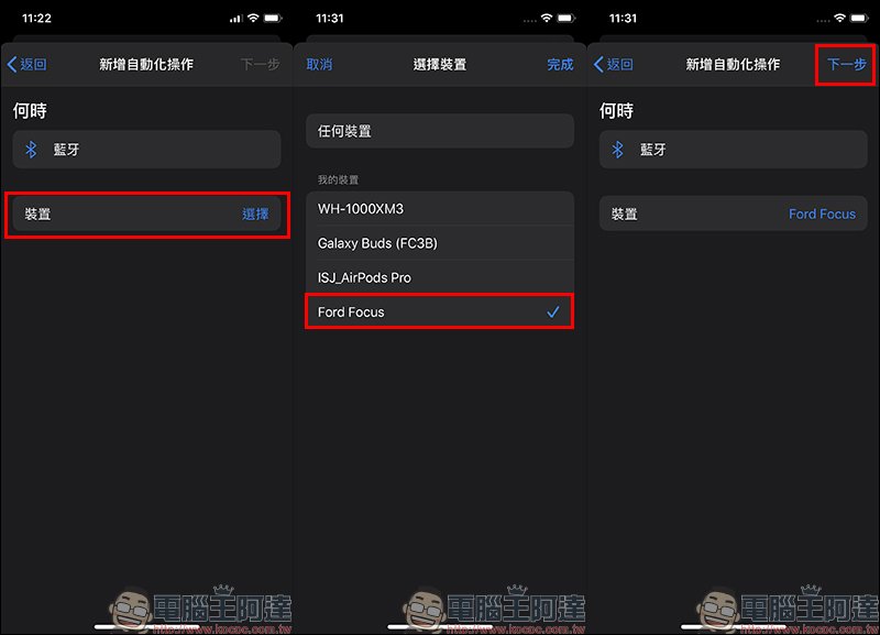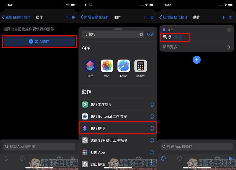 依照上述的條件,當 iPhone 連接到指定藍牙裝置後將自動化操作某個動作,而我們現在只要將執行捷徑作為要自動化操作執行的動作: