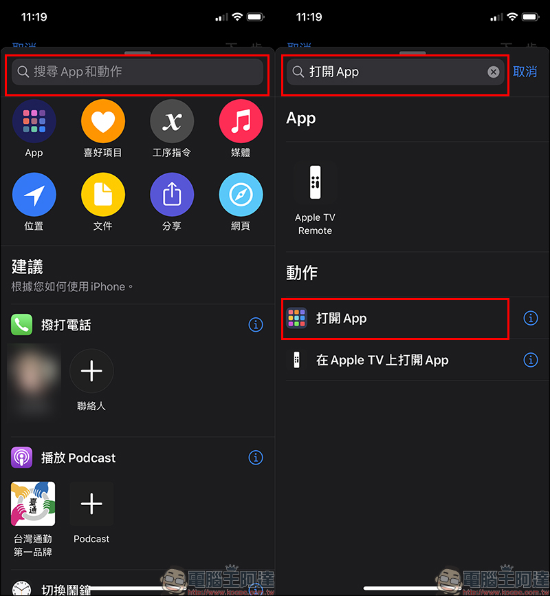 於加入動作頁面找到「打開 App」,若下方建議動作沒有看到這選項,則可透過搜尋方式找到它: