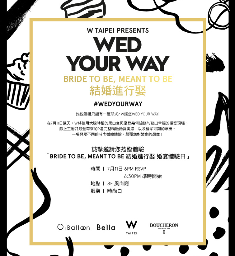 令人心動的抽獎好禮可是包含了W非凡套房住宿一晚、Boucheron精緻小禮、BELLA雜誌一年份等。W TAIPEI WEDDING 集結融合了時尚與動感,企圖充分的帶給每一對新人、閨蜜好友全方位的婚禮驚喜和派對饗宴! 現場來賓當天拍照打卡上傳至IG並使用#WEDYOURWAY以及#WTAIPEI公開分享即有機會抽中紫艷酒吧下午茶雙人券一組,報名購票連結