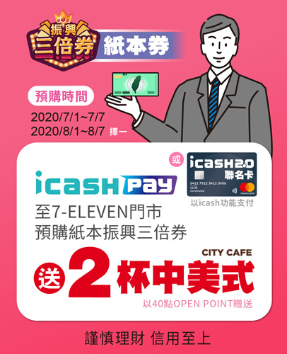 第一波紙本振興三倍券將於2020年7月7日22:00預購截止,第二波2020年8月1日--8月7日,只要持icash2.0聯名卡(以icash功能)或icash Pay至7-ELEVEN預購紙本振興三倍券,立即送2杯CITY CAFE中美式(價值70元,以40點OPEN POINT點數贈送),活動不限量。