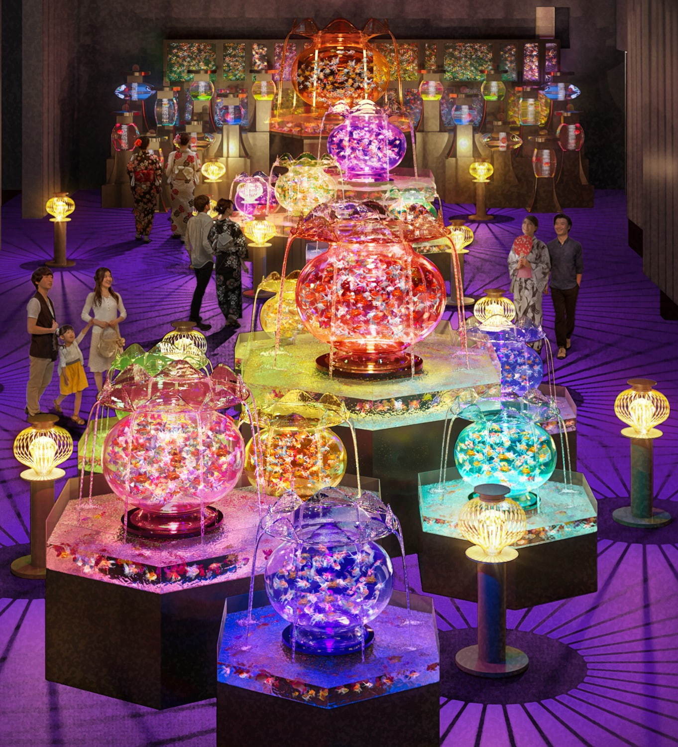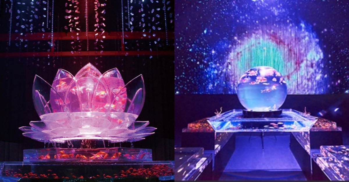 最後,展區內也結合了多個圓形地球、三角柱、蓮花等多邊造型的水缸作品,不僅讓人深切感受日式情懷,各色的燈光投影於上,金魚的身影搖曳舞動就像在欣賞其曼妙舞姿般,讓人目不轉睛。