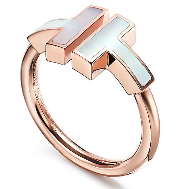 Tiffany這款戒指採用大膽前衛的「T」字設計,並採用珍珠貝母(在蠔殼中天然地閃著虹彩的物質),璀璨的亮光和優雅的光澤引人注目。「T」系列層次豐富並具標誌性,切實提醒我們那種感受得到卻並非總能看到的聯繫。這款線圈戒指可單獨佩戴,或配搭其它戒指,締造時尚造型。