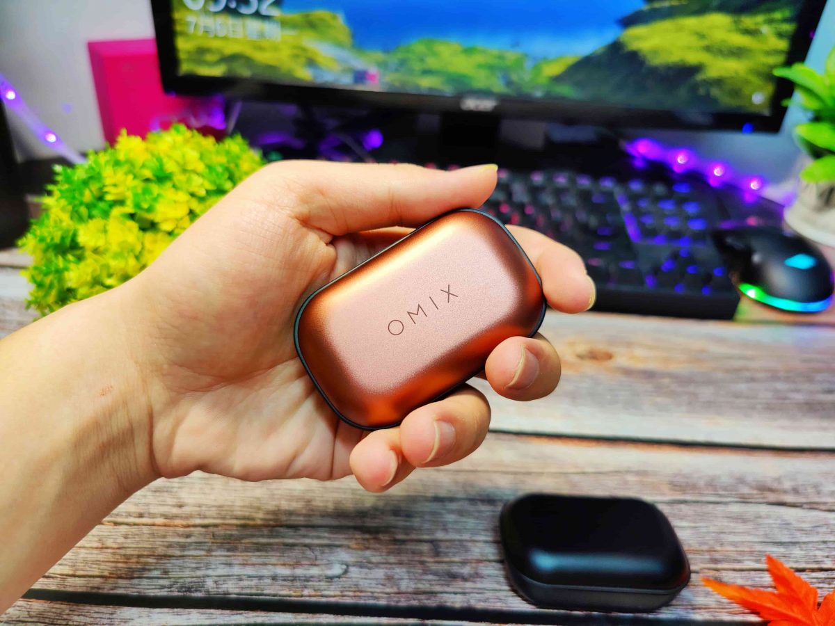 「 OMIX Y9 」充電艙與耳機本體皆採用金屬與塑料的複合式材質,外觀設計上相當具質感。在充電艙外殼還有特別進行噴砂處理,手感相當精緻,外型相當亮眼。因為金屬重量上本來就有些份量,因此耳機含充電艙總重 61 克。