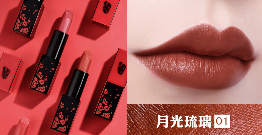 包裝走的是超美超古典的中國傳統風格,就連色號的名字都有藝術感,例如「朱顏依舊」、「燭影搖紅」,感覺使用之後立馬變成娘娘XD,網友最推的是#01月光琉璃,屬於氣勢款紅棕色,感覺年末派對季,畫上這一支就能驚豔全場!
