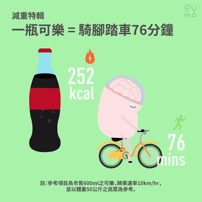 市售600ml的可口可樂,可是速食的最佳良伴,一瓶喝下肚的代價是252大卡,若是以騎腳踏車作為對應運動,請準備為它花上76分鐘的時間。