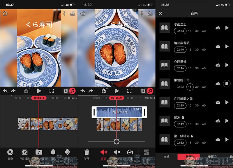 若想在影片搭配音樂,也提供獨立音軌通道可輕鬆管理、添加音樂,也可自行錄音導入影片中: