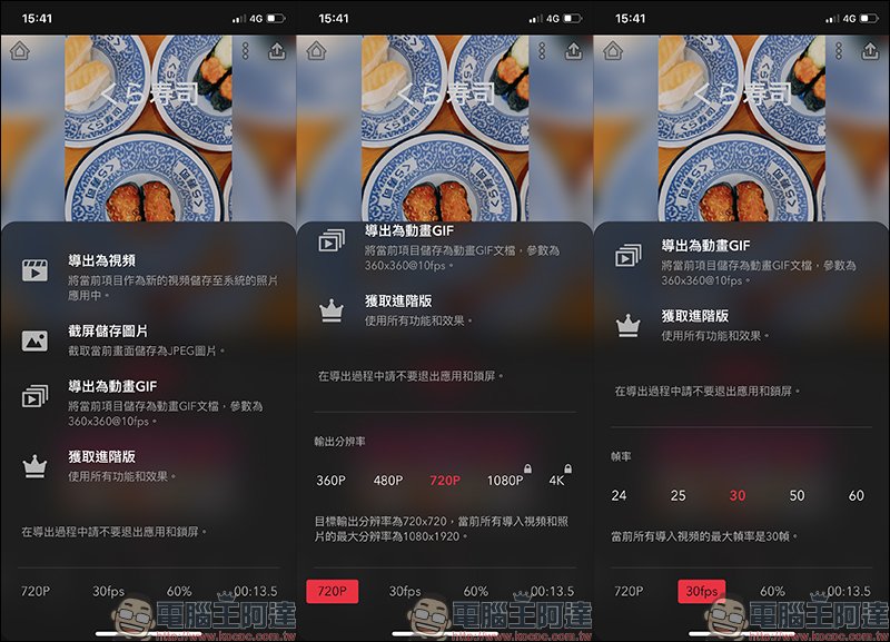 當編輯完成後,就能將影片輸出囉! Focos Live App 最高可輸出最高 4K 60fps 的影片,免費版也可輸出 720P 解析度的影片。若想使用 Focos Live App 內建的所有功能和效果,則可付費訂閱或買斷的方式選購 Focos Live 進階版。目前訂閱 1 個月為 70 元;訂閱 1 年費用為 290 元,一次買斷 App 的價格則為 490 元:
