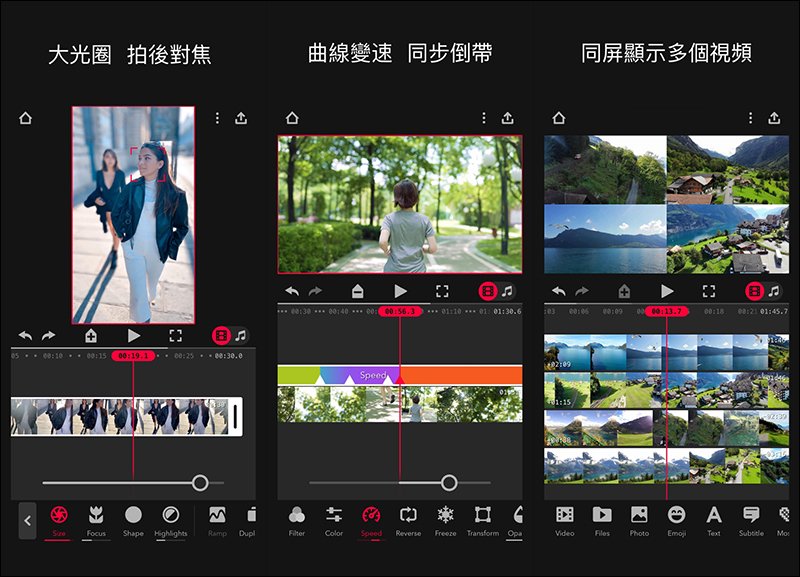 Focos Live App 不僅僅是人像影片的錄製工具,同時也是一個完整的影片剪輯工具,也能編輯其他非 Focos Live 錄製的影片。用戶可透過 Focos Live 添加多個圖層,在 Focos Live 內剪輯影片、添加文字、調整濾鏡、影片速率調整、影片倒轉、畫面轉場等各項設定。