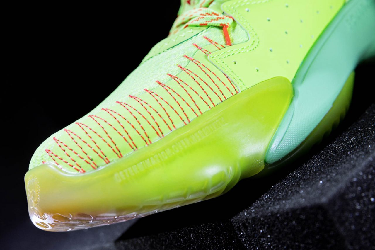 螢光綠樣式則屬於跟 Marvel 漫威英雄 – 蜘蛛人聯名的版本,鞋盒包裝也跟著換上漫威英雄們圖樣,然而不同於 D.O.N. ISSUE #1 化身不同裝扮的蜘蛛人,這次 D.O.N. ISSUE #2 主要聚焦蜘蛛人擁有的超能力,兩腳鞋舌環上印著 “SPIDEY” “SENSE!” 就是可以察覺危險並迅速做出反應解圍的超敏銳感官,“My Spider Sense is tingling.”正是蜘蛛人時不時掛在嘴邊的對白;Donovan Mitchell 主打後衛又身為球隊運作核心,如果說把他比作蜘蛛人,那解讀場上情勢的觀察力就是他的 Spidey Sense 吧!