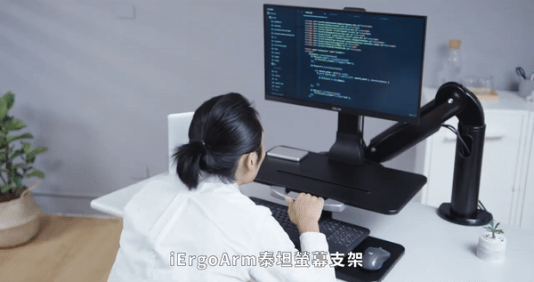 小編平常就有使用螢幕支架的習慣,幾年前,有一次非常瘋狂的使用了43吋的4K螢幕當成主螢幕使用,但只能鎖在牆上,對於桌夾式的支架有著一定的憧憬,這次接觸到了iErgoArm「泰坦」螢幕支架,可以上下移動的螢幕支架,使用起來非常方便,無論是站著還是坐著,都非常的方便,尤其是在整線上與收納空間上,都有著更便利的使用習慣,想站起來就透過桌板上的把手來控制,隨心所欲地想怎麼用就怎麼用: