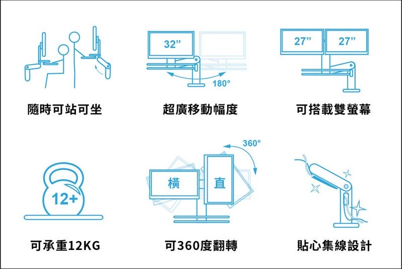 iErgoArm 泰坦螢幕支架的優點相當多,除了讓您隨時可以輕鬆切換工作姿勢減少疲勞與身體酸痛以外,還具備可搭載雙螢幕、螢幕可轉動、超廣移動幅度、可承重12公斤與貼心的收線設計,可說是讓您解放辦公桌與身體姿勢的好物: