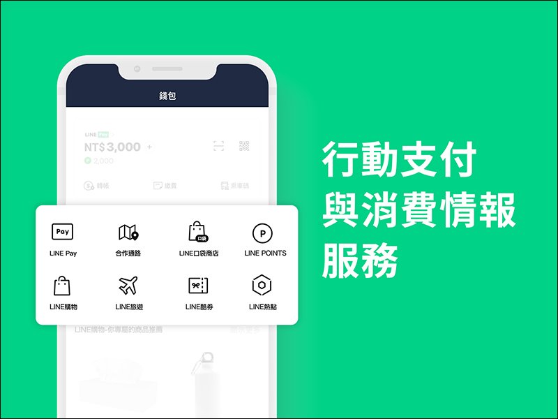 在全新的錢包頁面,也整合行動支付與消費情報相關的 LINE 服務。包括 LINE Pay 、 LINE Pay 合作通路、 LINE POINTS 、 LINE 購物、 LINE 酷券、 LINE 口袋商店、 LINE 旅遊以及 LINE 熱點( LINE SPOT):