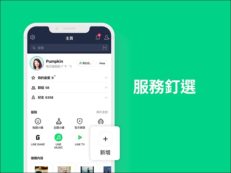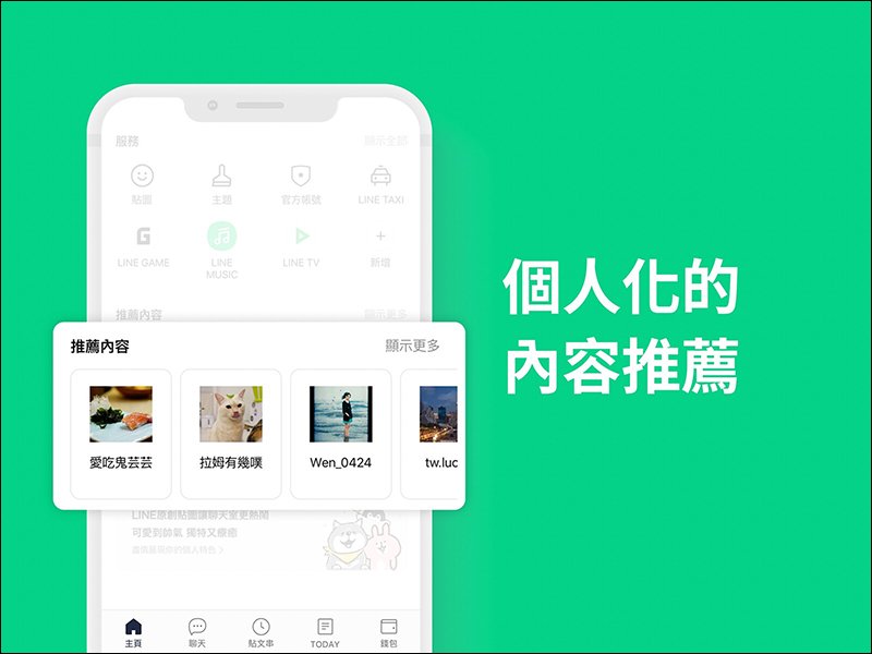 首先是 LINE 主頁,這個 LINE 服務入口在改版後不再分成五個橫向滑動的子頁面,提供使用更直覺簡單的介面,並加入個人化的設定與個人化內容推薦。