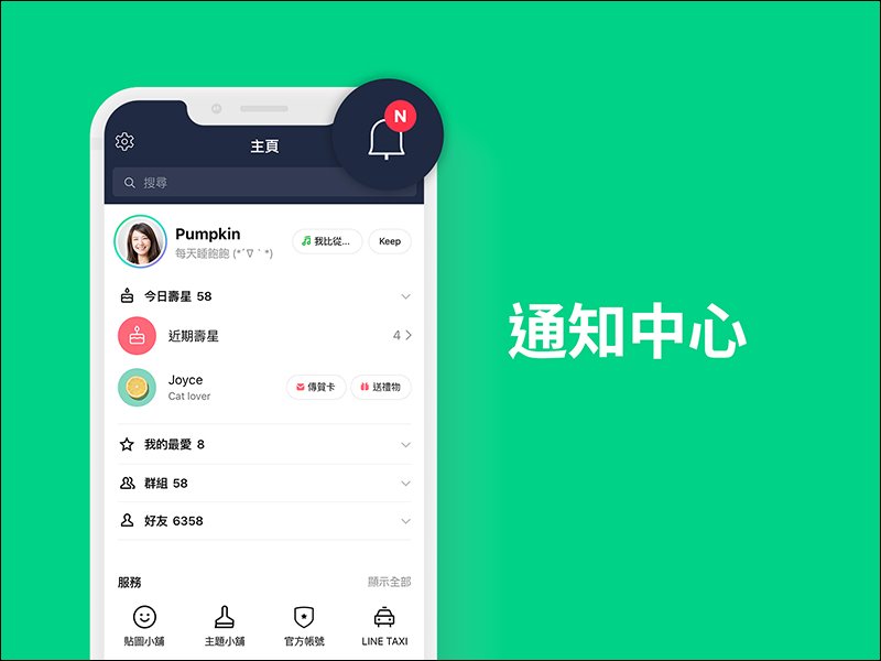 目前這個「小鈴鐺圖示」出現在 LINE 貼文串和 LINE TODAY 頁面上方,提供相關的動態通知。在改版後,「主頁」也新增一個小鈴鐺圖示,用戶可點選它開啟通知中心,掌握「與好友相關」的動態。例如,當用戶與某人成為好友、您可能認識的人、自己被群組邀請時、所有受邀者都已加入群組時,當「我的最愛」好友變更大頭貼、顯示名稱或背景音樂時也會出現在此通知中心。