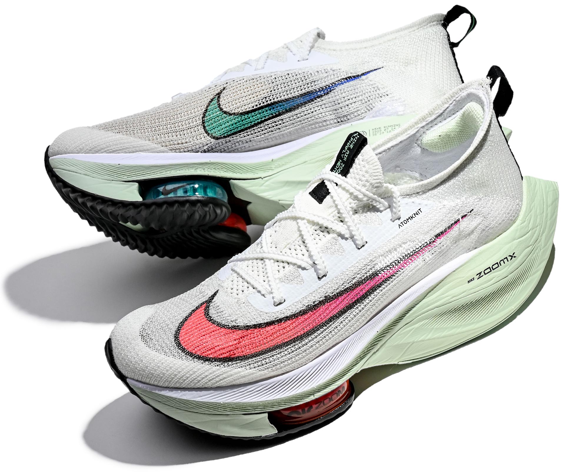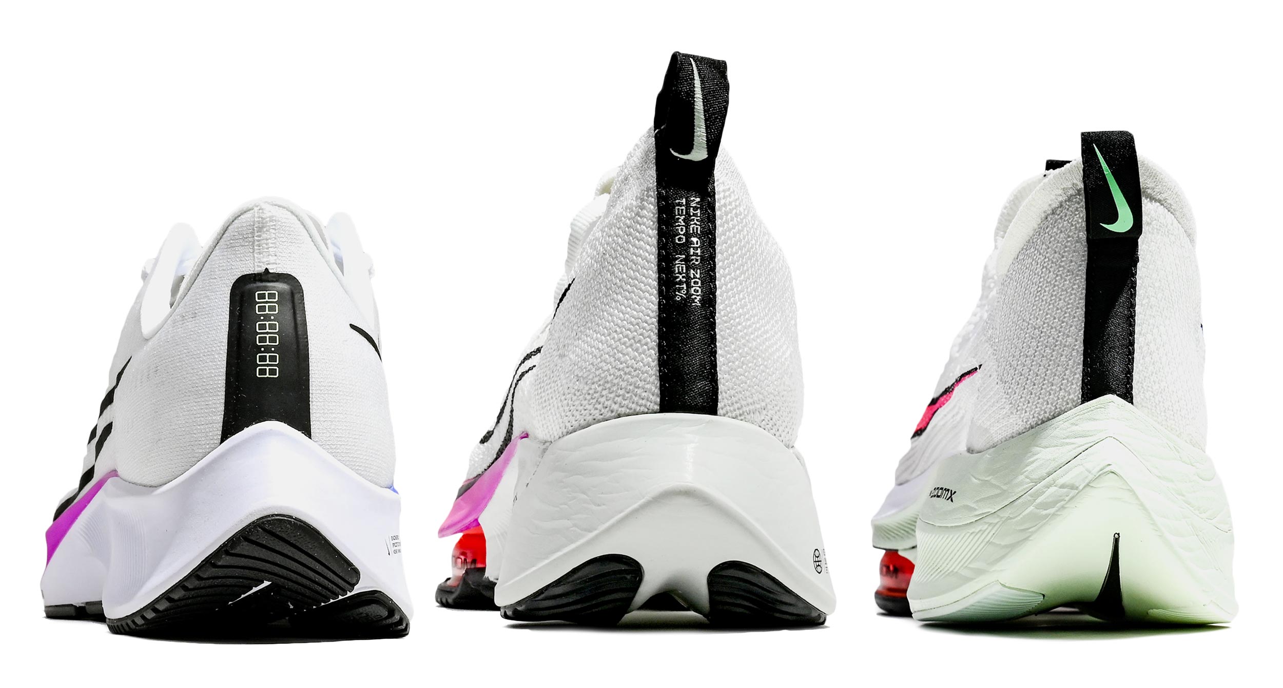 不同材料的鞋面帶來了第一印象上明顯的差距,PEGASUS 37傳統的網布材料與中段的合成皮革搭配,是三雙鞋款中最為柔軟的一雙,而高階的 ZOOM TEMPO NEXT% 還有 ALPHAFLY 不約而同的都採用了編織材質,但若仔細分辨,ALPHAFLY 的 ATOMKNIT 更為極致,把 FLYKNIT 材質經過蒸汽熨燙及拉長後更加輕盈貼合,有效避免滲水問題並提升透氣性。而 ZOOM TEMPO NEXT% 的鞋身設計也可見到受到 ALPHAFLY 的明顯影響,皆是具有相當高穩定性的設置。