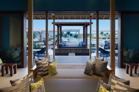 泳池旁的休息區,設置了一座座寬敞的水上涼亭,上頭擺了一顆顆的舒適抱枕。愜意地躺臥在「特等座席」上,欣賞絕美的落日風景至入夜後的滿天星辰,是一大享受!