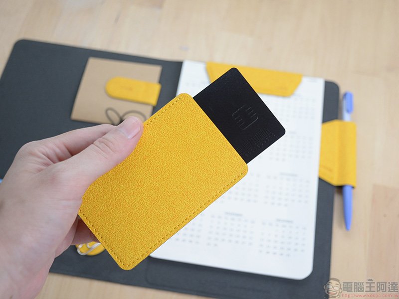 你可以將少量名片夾在其中,因應會議時可能需要與客戶、廠商交換名片之用,就算忘帶名片夾也有備用名片來頂著先。經過筆者實際測試,根據名片厚度不同,最多可以夾上 32 張名片都不是問題,一樣穩若泰山,外出開會可以說根本不需要另帶名片夾。