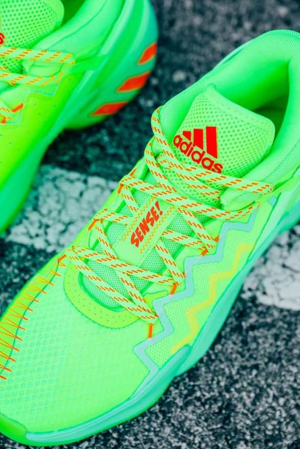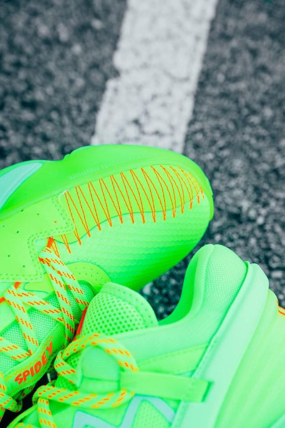 adidas D.O.N. Issue #2 首發配色「Spidey Sense」以螢光綠為主色調,搭配亮眼紅與薄荷綠兩色點綴鞋面;鞋款設計蘊含蜘蛛人元素與美式漫畫風格,鞋舌延伸處繡上 “SPIDEY” “SENSE!” 字樣,並於內側畫上蜘蛛人塗鴉圖像,猶如承襲蜘蛛人靈敏感官與超強反射能力,更凸顯聯名鞋款的獨一無二;鞋側以鋸齒線條展現蜘蛛感應的帥氣視覺張力,專屬 Mitchell 的蜘蛛標誌則印於鞋後跟,而美式漫畫內的常見用語「BOOM」、「POW!」、「SCREECH」也巧妙融入半透明大底,令整體設計更加豐富,無論場上場下皆能成為眾人目光的焦點。