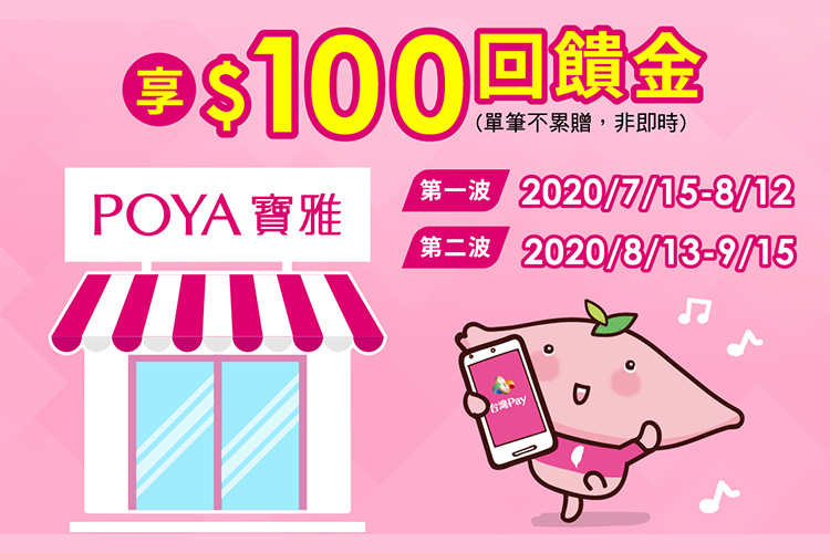 於活動期間內,至寶雅門市出示「台灣Pay」付款碼 (信用卡/金融卡/帳戶)進行支付,單筆消費金額滿500元(含)以上,可享100元回饋金(不累贈)