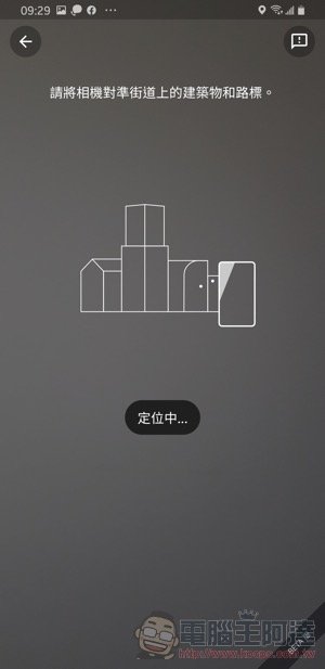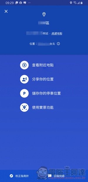 接著便會出現藍底的頁面,會顯示你目前位置的相關資訊,然後在支援此功能的 Google Maps 版本裡(目前小編使用 Android 版本會看到此頁面,但在 iOS 還沒看到),會多出一個「使用實景功能」的按鈕: