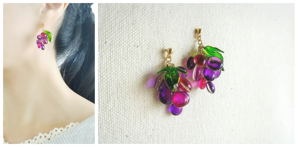 小編很喜歡這副葡萄耳環的設計,以晶瑩剔透的紫色珠珠串成葡萄的形狀,還細緻的模仿出了葡萄的葉子,戴在耳朵上小巧可愛,還會優雅的隨著行動擺動。