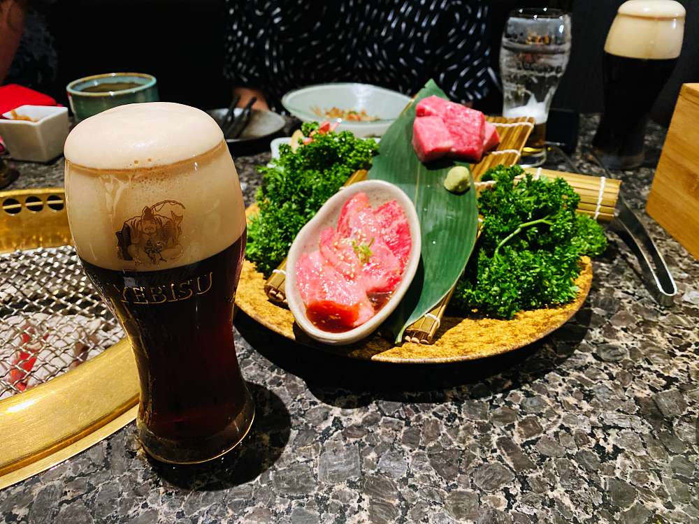 老乾杯也針對兩款啤酒做推薦菜單,YEBISU惠比壽啤酒的味道清爽帶著苦味,適合搭配前菜、和牛前胸紛雪燒或老乾杯鹽蔥燒,既能品嚐到酒香,也能感受肉質的鮮甜。