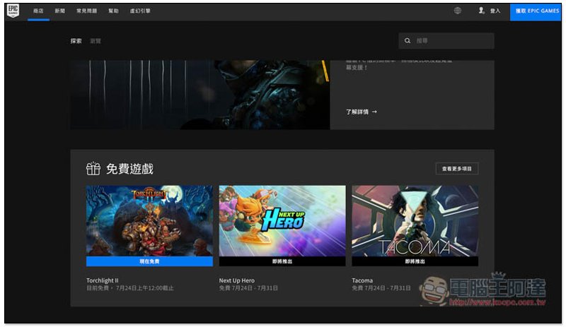 現在進到 Epic Games 商店後,免費遊戲區塊就會看到「火炬之光 2(Torchlight II)現在免費」的消息,限免活動到 7 月 24 日上午 12:00 截止。下一波的免費遊戲名單也已經公佈,分別為「Next Up Hero」與「Tacoma」,7 月 24 日開始至 7 月 31 日: