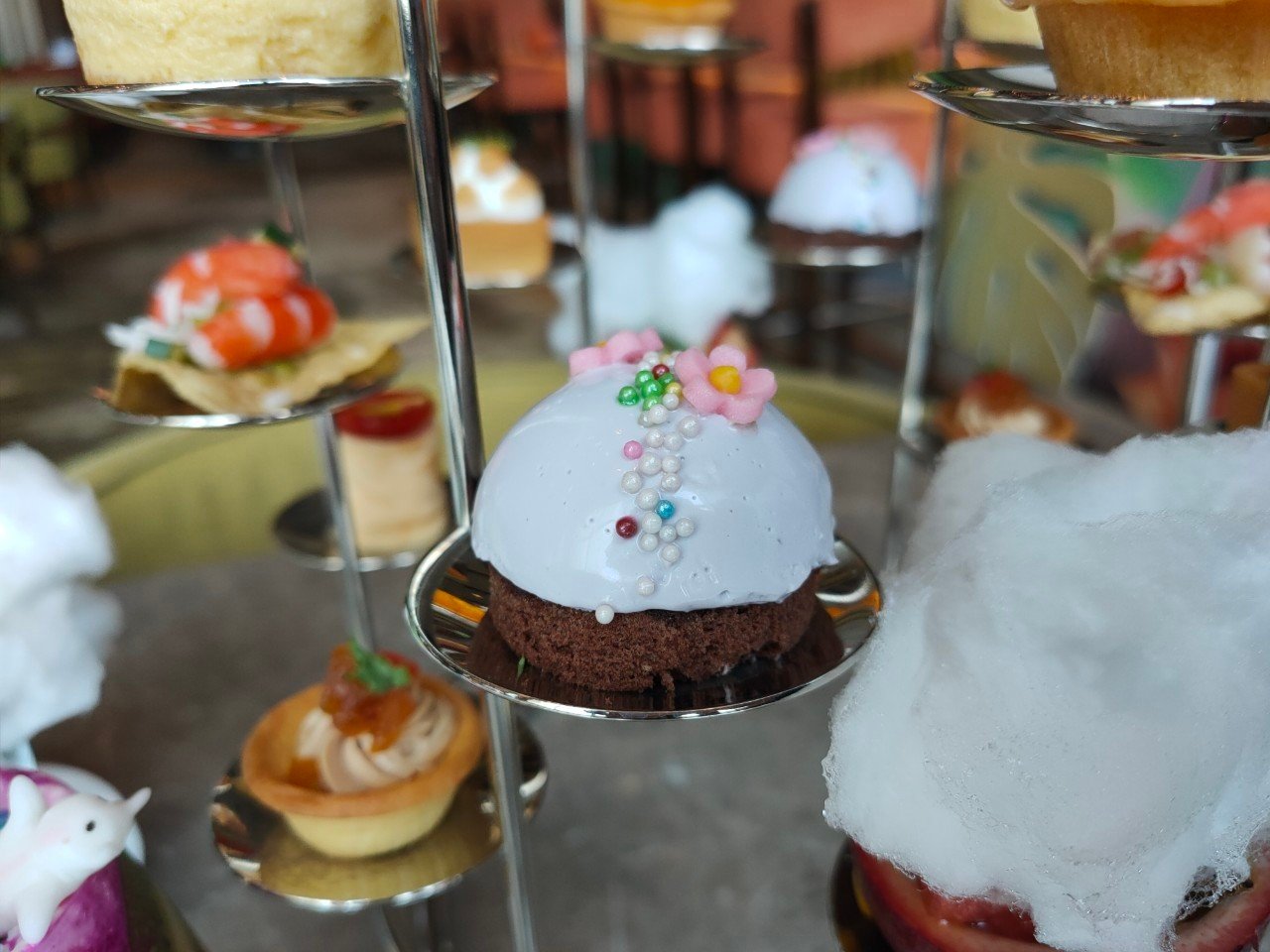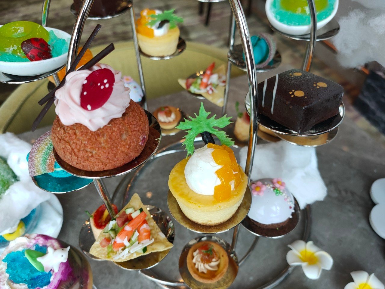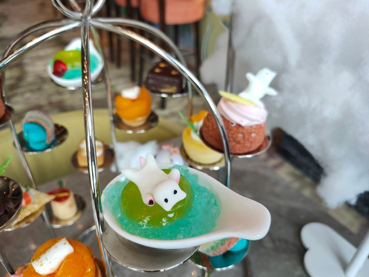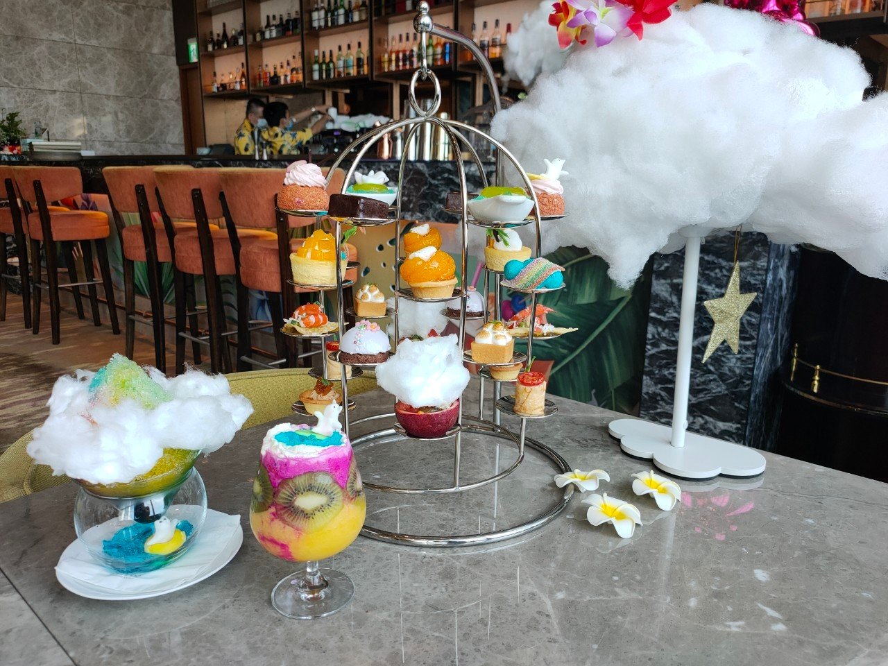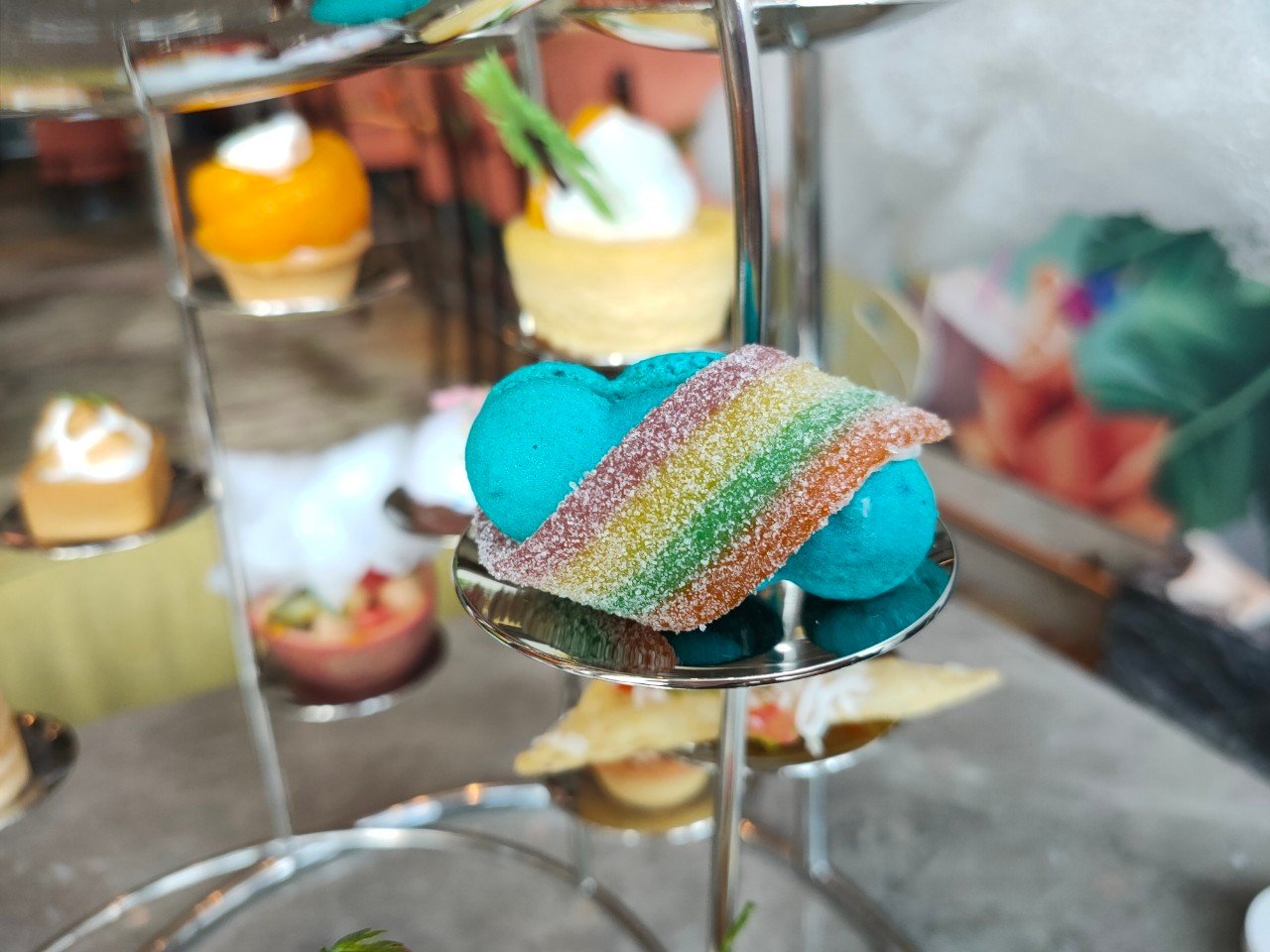 這一波的清涼系下午茶,以夏日水果為主題,再搭配上夏威夷特色,設計出各種超可愛又具話題12款甜、鹹點,其中超可愛的「雲朵馬卡龍」還特別製作成藍色雲朵形狀,內層包的還是涼涼的薄荷餡呢,加上一道彩虹軟糖,夏日天空就在眼前呈現!