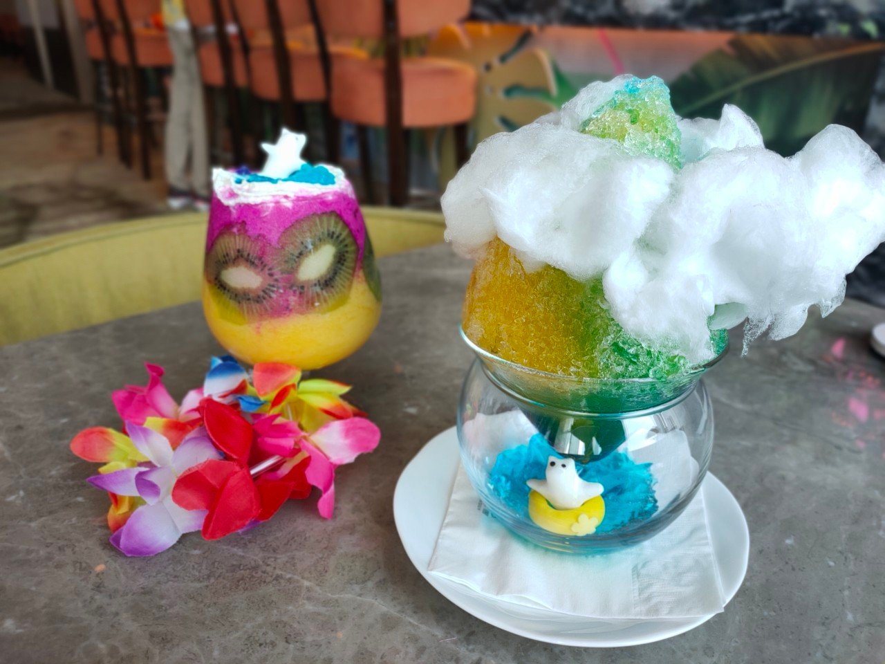 另外妞妞們不可錯過的還有這杯「喵游可愛島」,就是發想自夏威夷的特色冰品「四色彩虹」,紅、黃、藍、綠色冰上還覆蓋著白色雲朵棉花糖,淋上香甜的椰奶後,彩虹冰山就會從雲中冒出來啦~冰碗下有一隻超可愛的貓咪趴在游泳圈中,漂浮於藍色大海,好吃又可愛呢。