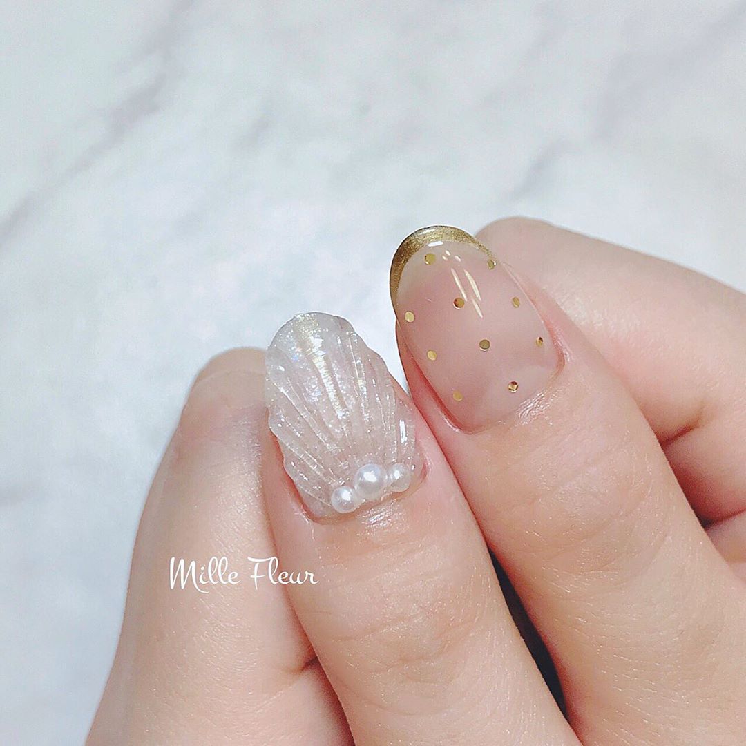 如果不喜歡過於花俏的造型,也可以嘗試圖中這款「亮光波點珍珠」,以乳白色+亮粉作為指甲基底,勾勒出貝殼紋路後再鑲綴珍珠,簡約又不失貴氣。其他手指也可做成金色款與之搭配,像是如同法式指甲般只在前端半月型處塗色,再簡單地畫上圓點點,一手是氣質優雅,一手則是可愛俏皮!