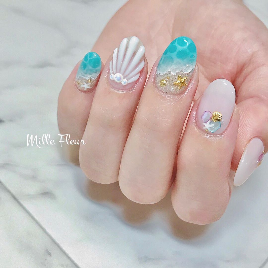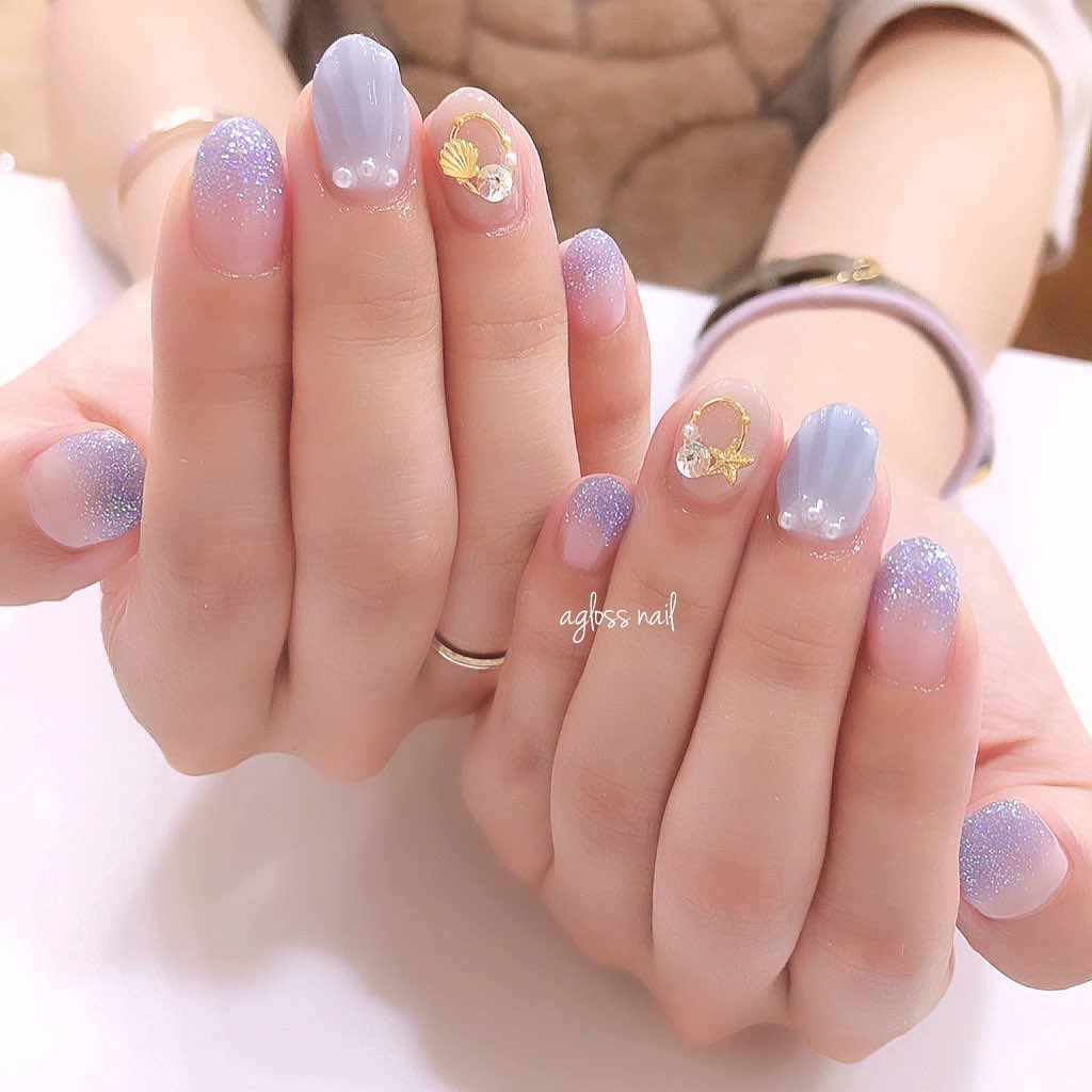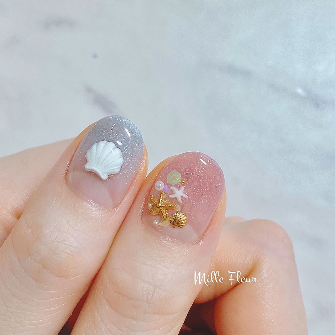 若妞妞們也想嘗試近期超流行的美人魚美甲的話,非常推薦從基本款「浪漫海灘」開始,在海邊漫步一邊欣賞沁藍汪洋,一邊撿著貝殼留念,光想像畫面就令人憧憬不已,何不將這美景化為指尖上的藝術呢?以淺色為指甲基底並撒上些許亮粉,藉由貝殼、海星、珍珠等裝飾來營造夏日風情!