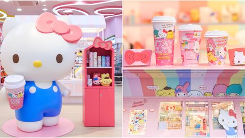 聯名店內有大型的170公分Hello Kitty造型公仔迎賓,手上也拿著Hello Kitty與三麗鷗成員的現萃茶杯,可愛爆表邀您一起享用下午茶!