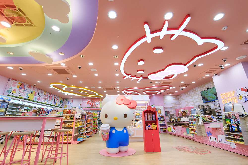 店內中間有170公分高的Hello Kitty等粉絲來合照,仔細看可以發現她手上還拿著7-11的現翠茶喔!(笑)天花板以Hello Kitty、美樂蒂與布丁狗造型妝點,牆面與櫃檯也充滿的滿滿的三麗鷗明星,另外在休憩區的桌子上還可以看到療癒的毛絨玩偶們。